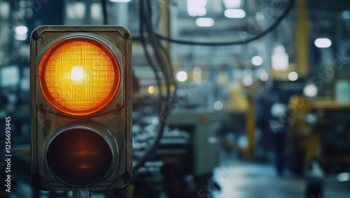 traffic, light, signal, amber, warning, industry, factory, machinery, production, manufacturing, industrial, automation, technology, equipment, orange, safety, alert, caution, hazard, risk, control, system, transport, metal, old, vintage, rust-eaten, weathered, worn, blurry, background, dark, dim, illumination, electric, power, bright, glowing, lens, sharpened