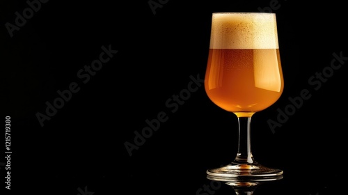 Amber beer in a tulip glass with frothy head on a black background with reflection and ample copy space.