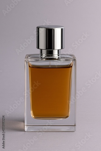 Amber cologne bottle with silver cap on gray background