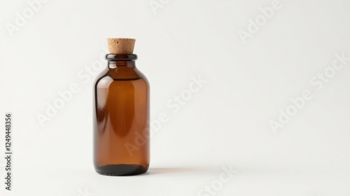 Amber glass bottle with cork stopper on white background, ideal for essential oils, serums, or other liquids.