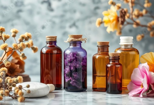 Amber glass bottles, dried flowers, marble Natural organic spa products, wellness products, still life