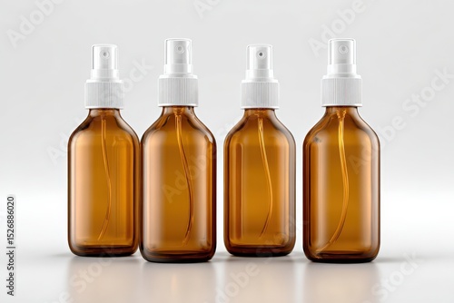 Amber glass bottles stand in a row, ready for cosmetic use. Product mockup, essential oil, pharmaceutical, packaging design, liquid storage