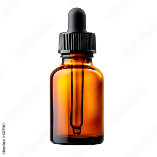 Amber glass dropper bottle isolated on a white background, perfect for essential oils or tinctures.