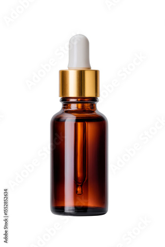 Amber glass dropper bottle with a white tip and golden cap. Png, Transparent background.