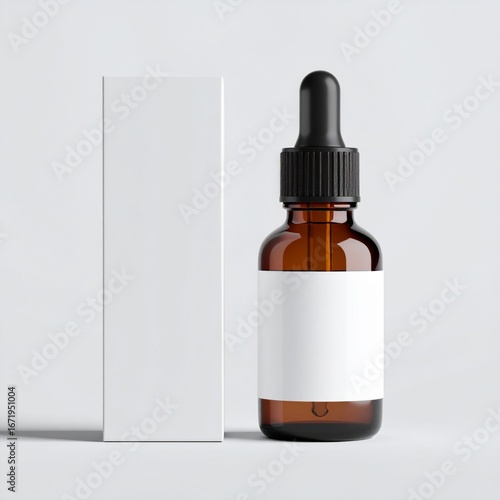 Amber Glass Dropper Bottle with Blank White Label and Paper Box in Clean Setting