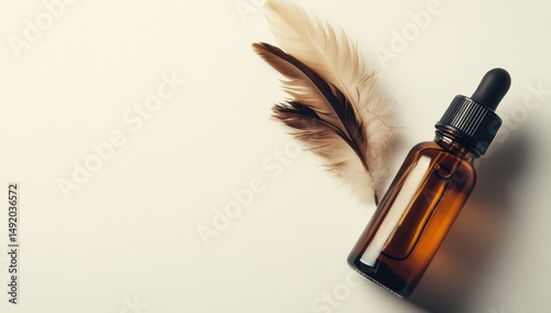 Amber glass dropper bottle with feathers on a white background