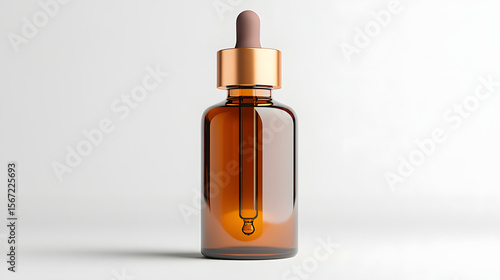Amber glass dropper bottle with gold cap and pipette, standing upright on white background, ideal for skincare serum or essential oil product mockup, minimal and clean style