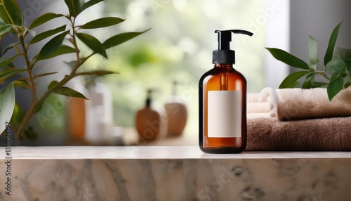 Amber Glass Pump Bottle Mockup on Stone Counter Elegant, Timeless, and VintageInspired Still Life, Perfect for Digital Art, Home Decor, or Design Inspiration.