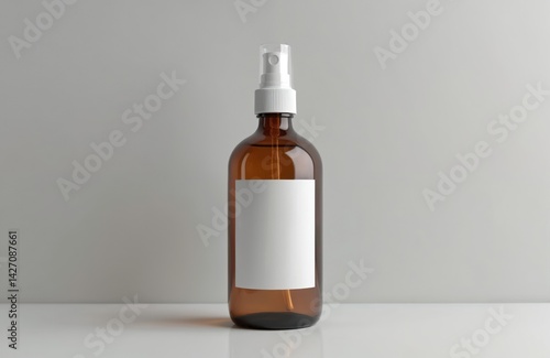 Amber glass spray bottle mockup with blank label on light grey background. Product presentation mockup. For cosmetic branding, skincare, medicine, apothecary, pharmacy, health care. Blank label ready