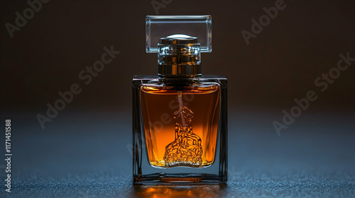 perfume, fragrance, bottle, amber, glasses, liquid, scent, aroma, spray, beauty, cosmetic, luxury, fashion, elegant, stylish, gold, brown, dark, shadow, light, design, product, object, image, photo, background, still, life, closeup, detail, texture, shiny, transparent, clear, square, cap, top, atomizer, woman, man, unisex, smell, odour, essence, modern