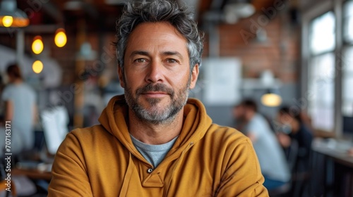 Ambitious tech start-up founder in a casual office, embodying entrepreneurial spirit and innovation.