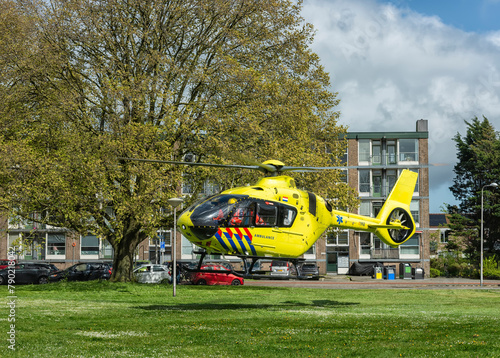ambulance helicopter takes off from a lawn in the middle of a residential area