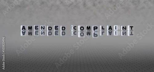 amended complaint word or concept represented by black and white letter cubes on a grey horizon background stretching to infinity