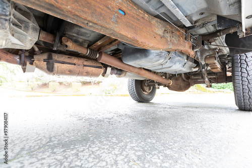American 4x4 old vintage classic off-road truck rusty strong underneath picture axles shock absorbers yoke differentials muffler. high quality picture for download
