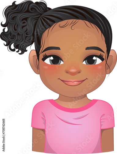 American African little girl face, avatar, kid head with long curly hair and bun hairstyle or side tie hairstyle cartoon PNG