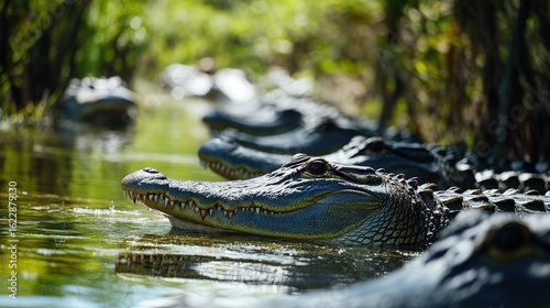 American Alligators basking in their natural habitat in a swampy environment