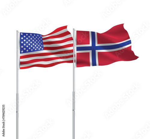 norge, norwegian, america, american, us, flag, together, pole, vector, transparent, waving, isolated, white, bilateral, us, nation, national, deal, meeting, foreign, policy, us, isolated on white, signs, fold, flag, illustration, country, wind, side, glossy, realistic, 2