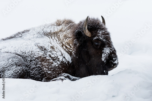 American Bison (Bison bison) aka buffalo laying down in the snow in Yellowstone National Park