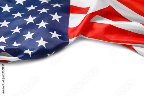 American flag on a white background, copy space. Symbol of independence, patriotism.