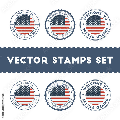 American flag rubber stamps set. National flags grunge stamps. Country round badges collection.