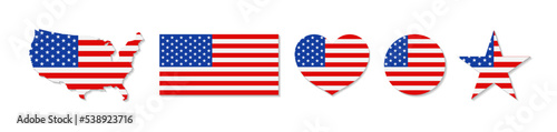 American flag. Usa flag with different forms map, circle, heart, star and rectangle. Icons of united states of america. Patriot emblems with shadow. Memorial day with symbols of proud. Vector