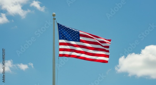 American Flag Waving Proudly Against a Bright Blue Sky with Fluffy White Clouds