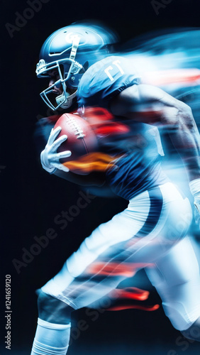 American football player running with the ball. Dynamic motion effect with blurred light trails. Sports photography concept for design and promotion