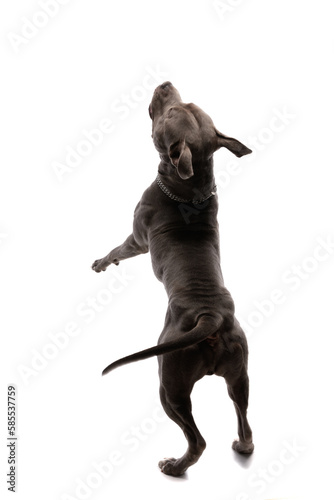 dancing, moving, dynamic, fun, joy, disco, club, party, standing, back, rear, hind, leg, paw, full body, full-length, backview, dog, puppy, terrier, animal, pet, purebred, pedigree, pedigreed, breed, cute, adorable, sweet, beautiful, looking, wearing, collar, leash, happy, white, isolated, studio, background