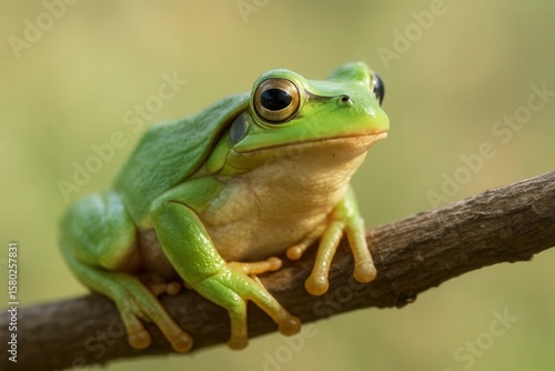 Amidst the tranquil greens of nature, a vibrant green frog sits poised on a branch, its eyes reflecting the world around it with an air of calm curiosity