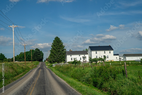 Amish houses beside a county road in Holmes County, Ohio on a summer day