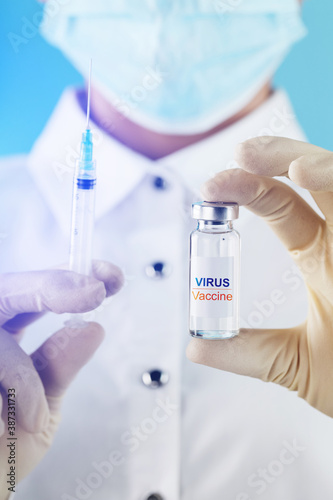 Ampoule with the vaccine against the Virus from diseases on a blue background in the hands of a doctor, scientist in gloves and a mask. Free space on the ampoule label for text.