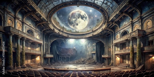 theatre, abandoned, ruined, overgrown, moon, sky, night, stage, debris, nature, reclaim, decay, architecture, column, balcony, seat, dust, light, darkness, silence, dramatic, eerie, haunting, majestic, forgotten