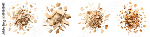 An abstract arrangement of broken scattered wooden planks chunks and splinters representing the aftermath of construction or demolition work