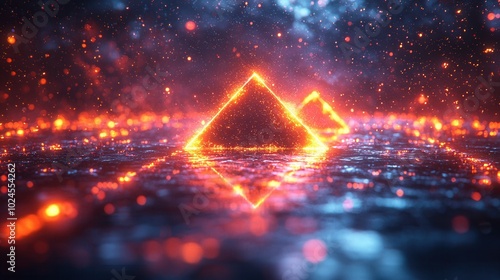 An abstract art piece featuring glowing pyramids amidst shimmering particles on a reflective surface. The vibrant colors create an otherworldly atmosphere.