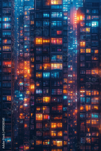 An abstract cityscape at dusk, with windows lighting up in different colors, forming a chromatic rhapsody across the skyline,