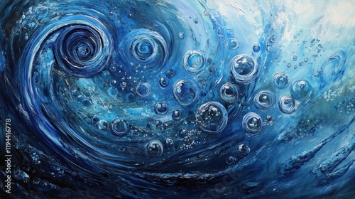 An abstract composition of swirling blue water with intricate bubbles and rippling patterns, evoking energy and vibrancy in a modern design