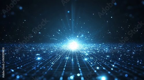 An abstract composition showcasing luminous particles and a bright source, creating a mesmerizing digital landscape.