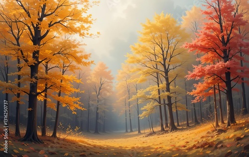 An abstract illustration of a colorful autumn forest with leaves falling from trees