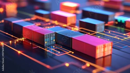 An abstract representation of digital technology with glowing containers and circuit patterns.