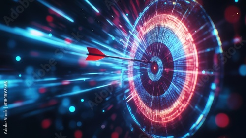 An abstract scene of a dart hitting a glowing target with vibrant blue and red light trails.