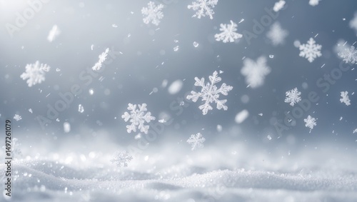 An abstract winter scene created by snowflakes swirling in the wind against a white, translucent background