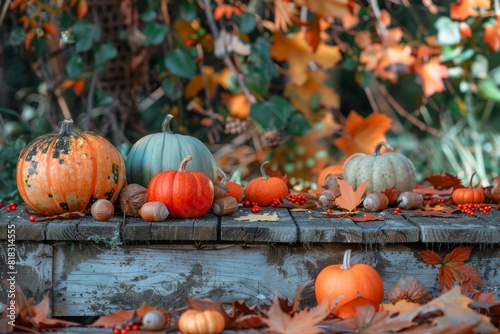 An abundant assortment of fresh fruits and vegetables arranged on a weathered wooden table, capturing the essence of the autumn harvest season.