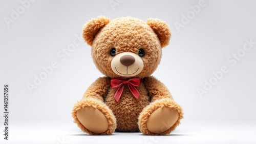 An adorable brown teddy bear with a red bow sits against a light gray background ready for a loving home.