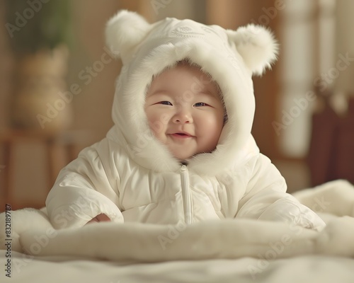 An adorable child is in the softness and comfort of the baby clothing