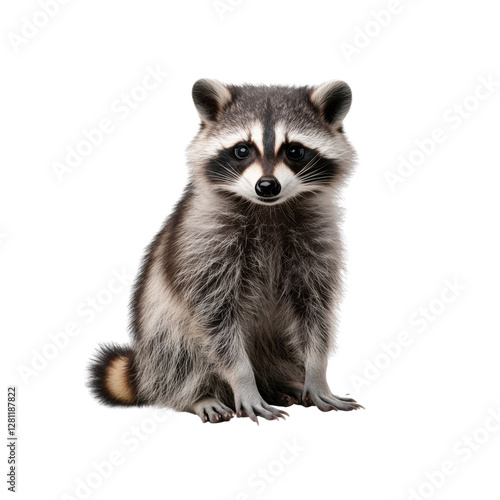 An adorable raccoon sits and looks at the camera with its black and gray fur, isolated on a transparent background