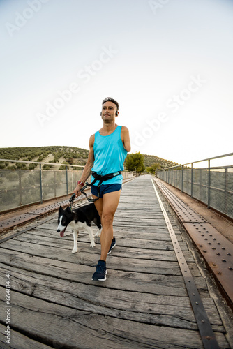 An adult athlete with an amputated arm is taking a walk with his dog using a harness on an outdoor bridge. Canicross concept. Activities with animals.