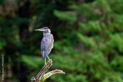 An adult great blue heron (Ardea herodias) perched beside a river in Misty Fjords National Monument, United States of America
