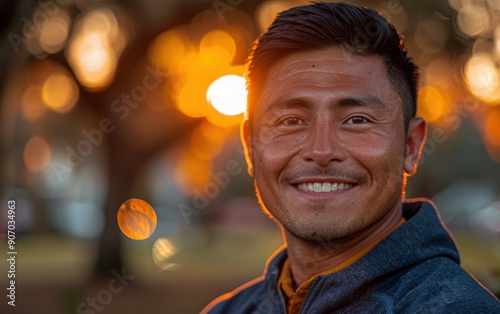 An adult Hispanic person is joyfully playing frisbee in a park, surrounded by beautiful sunset colors and trees, showcasing an active lifestyle