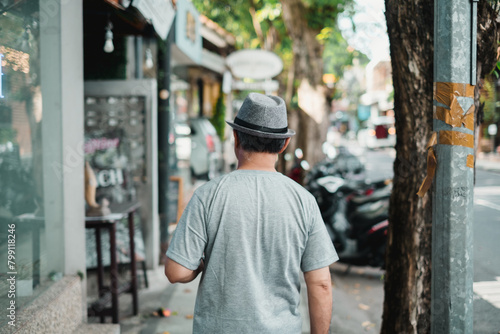 adult, man, male, guy, grey, hat, clothes, t-shirt, shirt, walk, street, bali, indonesia, asia, bokeh, background, people, person, travel, tour tourism, destination, explore, city, town, urban, blur, casual attire, sunny, midday, morning, bright, photo, sidewalk, lifestyle, summer, tropical, public, space, style, unrecognizable, pedestrian, ambience, mature, walking, portrait, age, outside, one person
