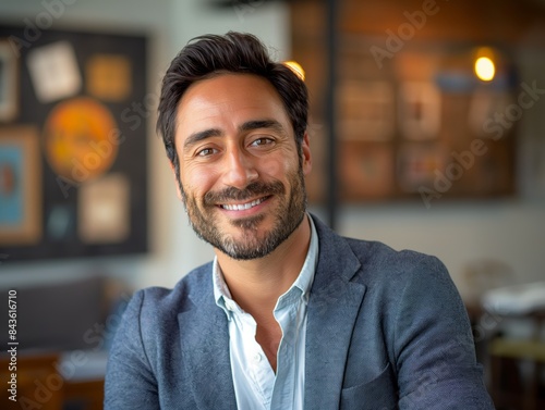 An Advertising Executive male wearing professional attire, standing in front of an advertising agency backdrop, smiling and looking into the camera